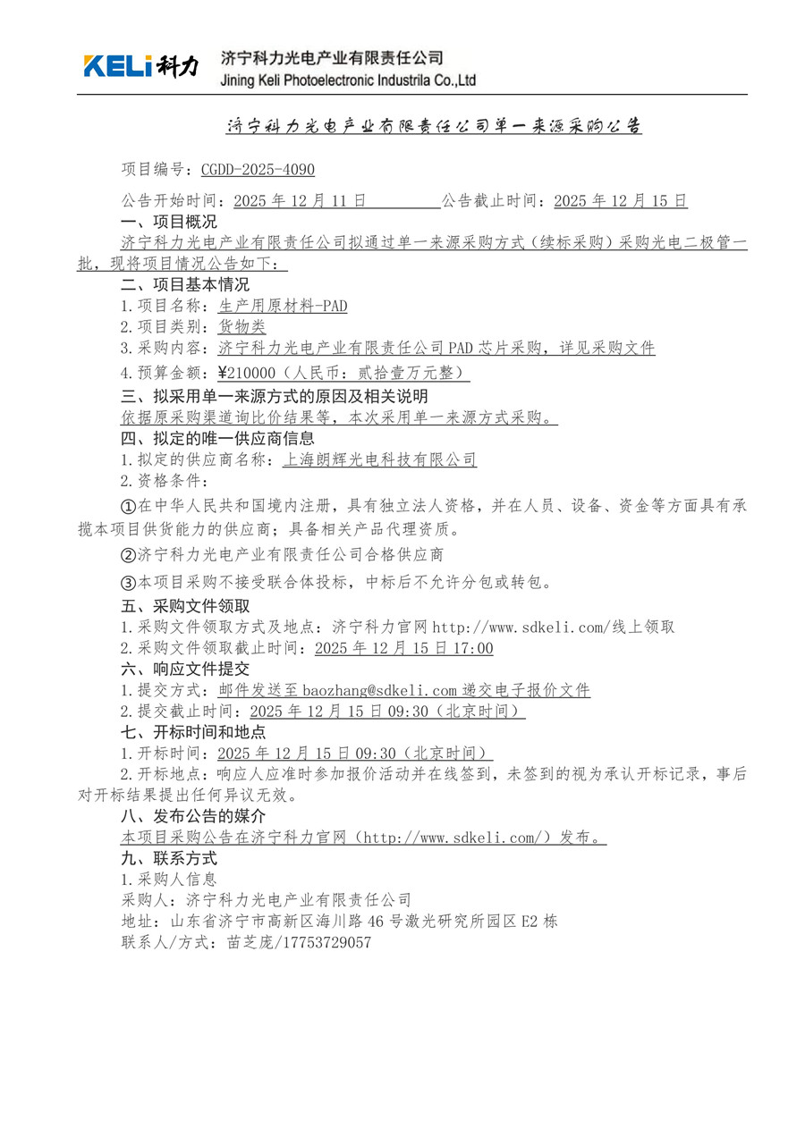 济宁科力光电产业有限责任公司单一来源采购公告_项目编号:CGDD-2025-4090